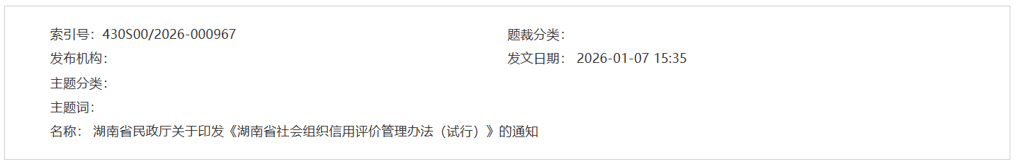 湖南省民政廳關于印發(fā)《湖南省社會組織信用評價管理辦法(試行)》的通知發(fā)表時間:2026-01-12 17:25